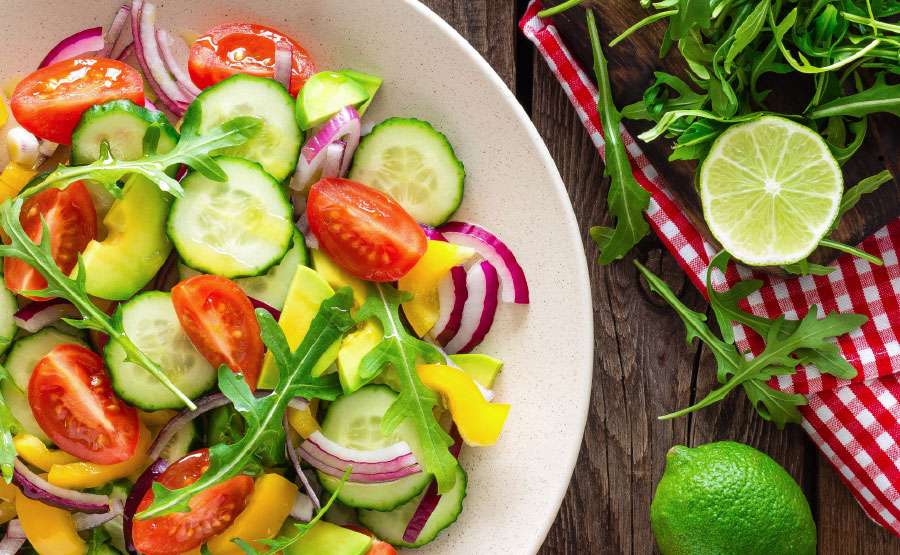 1. Spoel de tomaten, de paprika en de komkommer onder stromend water schoon en droog na met wat keukenpapier.